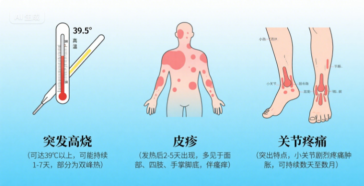 基孔肯雅热的潜伏期通常为3-7天(范围1-12天),临床表现为以下症状为主: