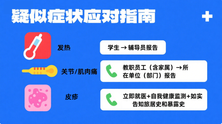 若出现发热、关节痛等疑似症状,须立即就医并申请暂缓返校。
