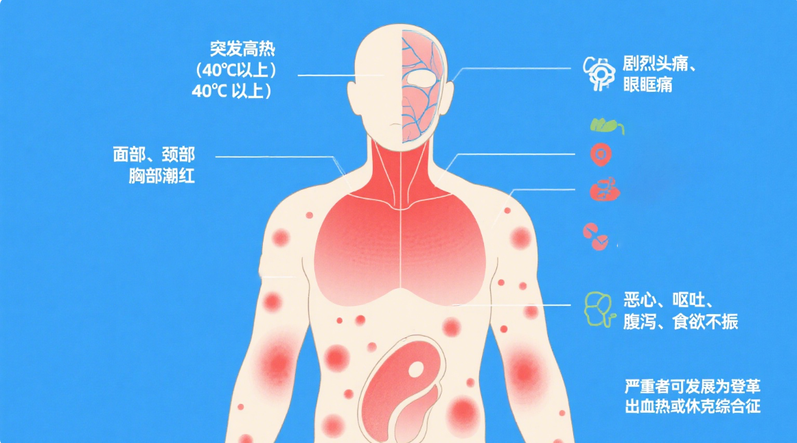 (1)突发高热:体温迅速升至39℃以上,持续1-7天,部分患者可能出现“双峰热”(退烧后再次发热)。