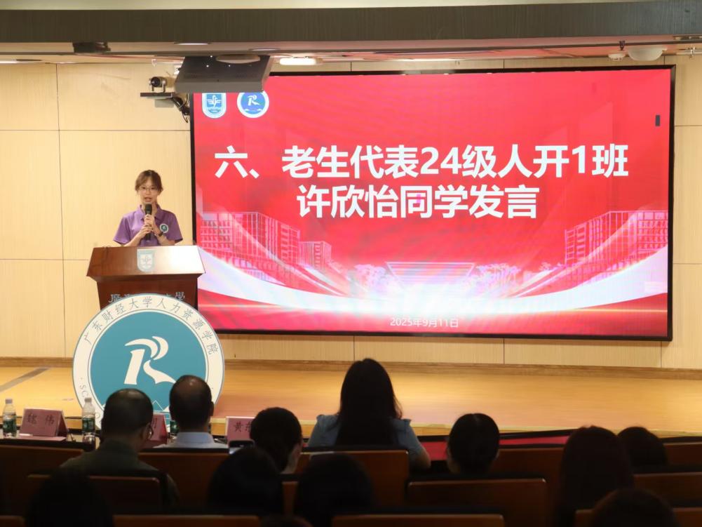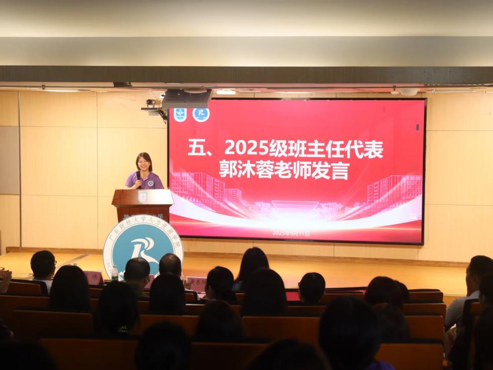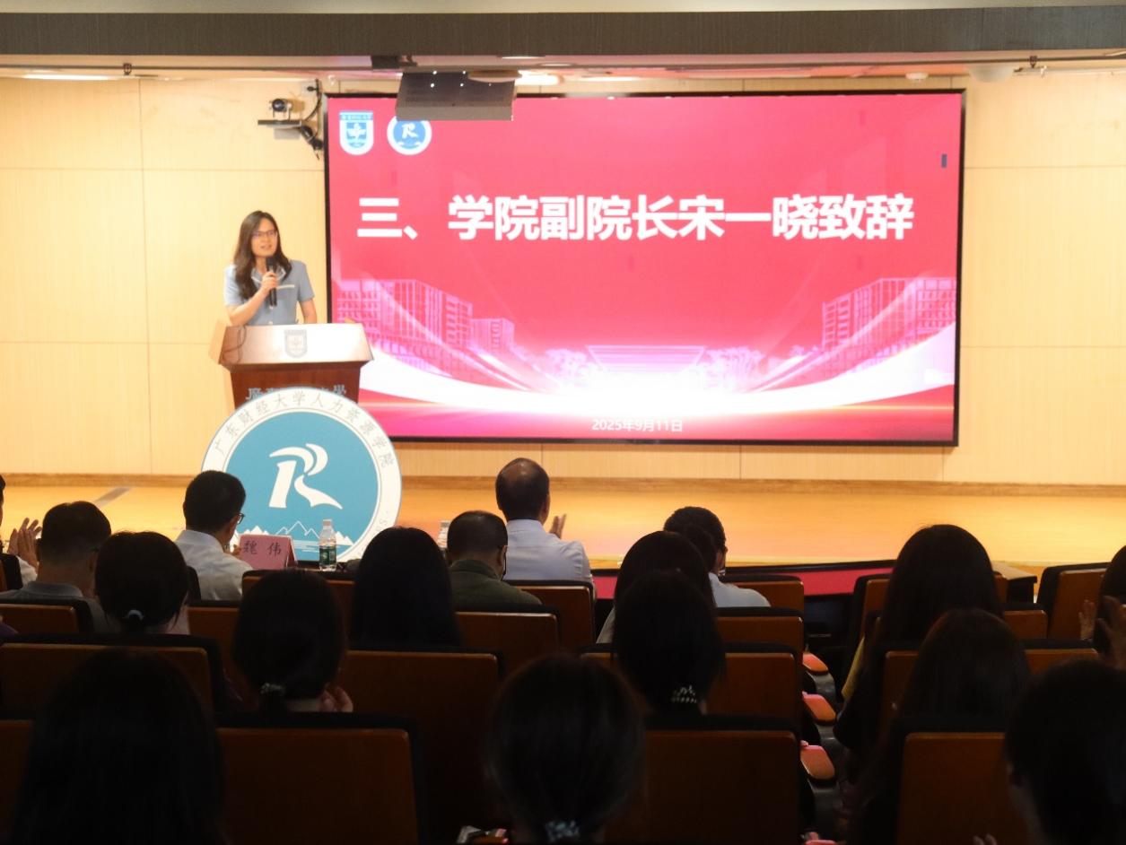 会上,宋一晓副院长寄语新生要珍惜时光,既要增长知识,更要开阔眼界,勇于走出舒适区、探索更好的自我。魏伟副院长全面介绍了学院发展历程与学科布局,增强了新生的认同感与归属感。班主任代表郭沐蓉老师以师长与师姐的双重身份,勉励同学们勇敢面对挑战,书写属于自己的精彩。2024级学生代表许欣怡分享了学习与社团经历,鼓励新生敢于尝试、善于沟通,在多元舞台上成长成才。2025级新生代表陈慧盈表达了对新生活的憧憬与对未来的坚定信念,展现出新时代学子的青春风貌。
