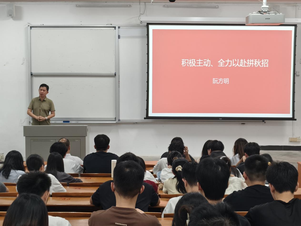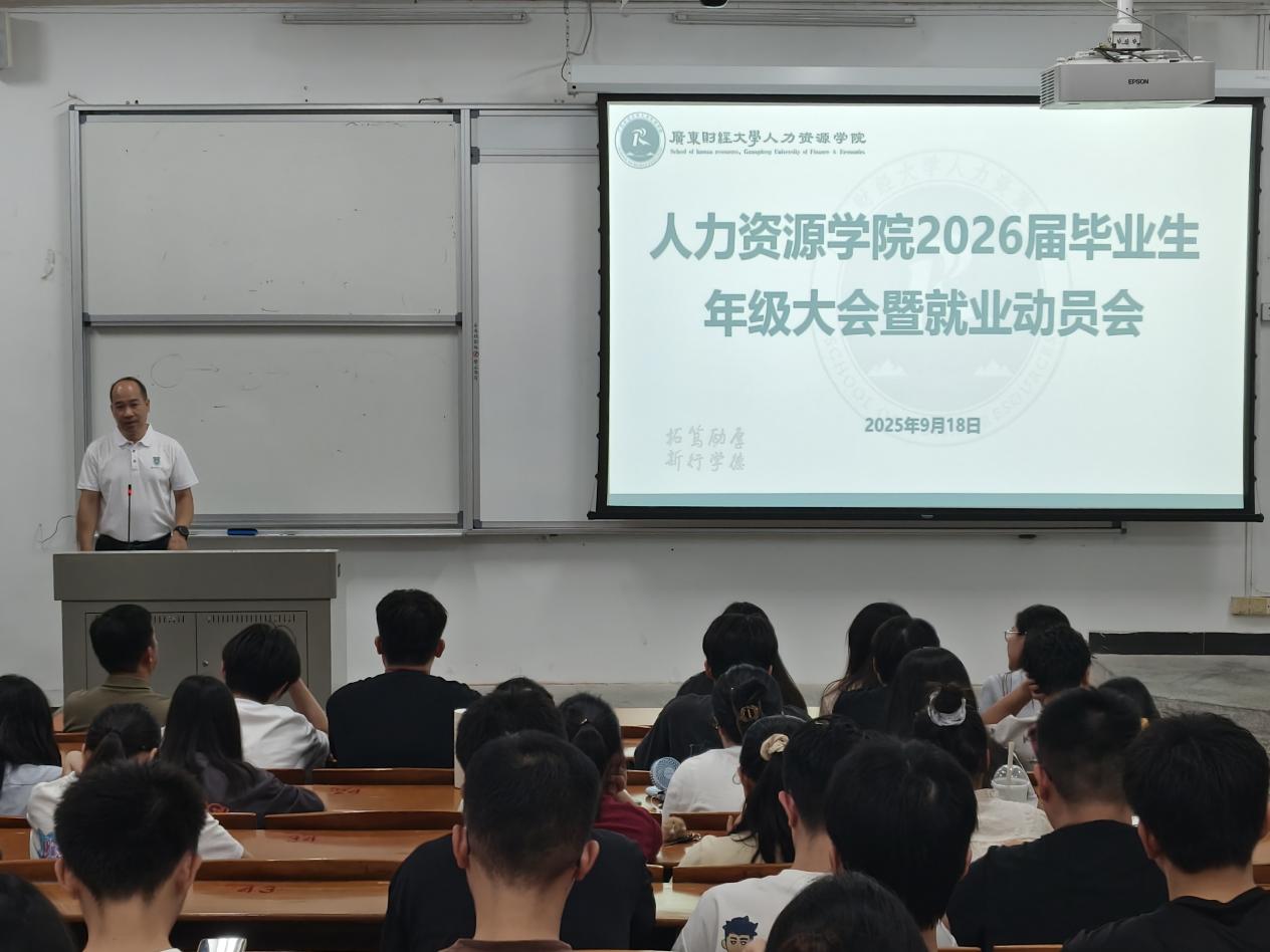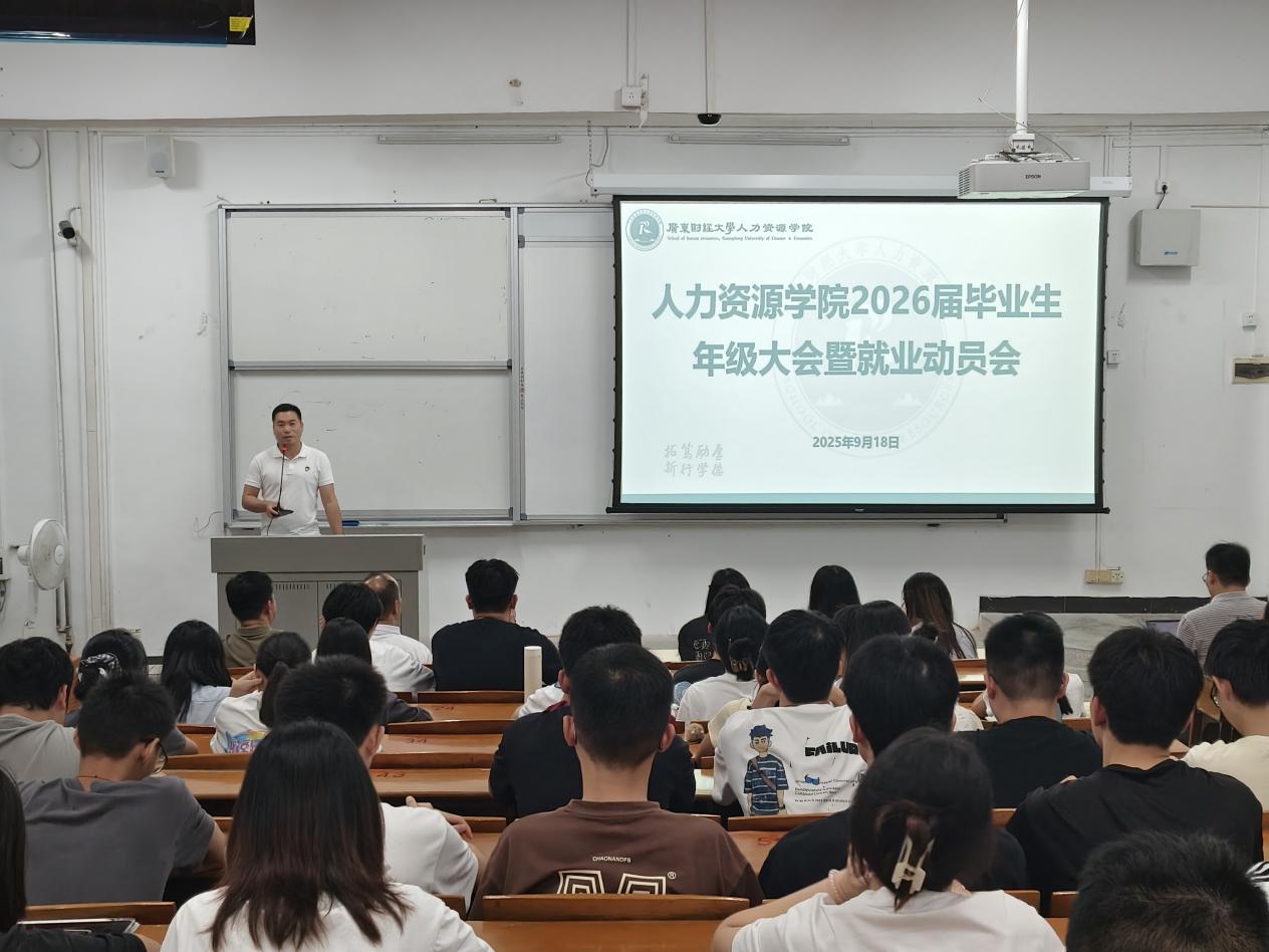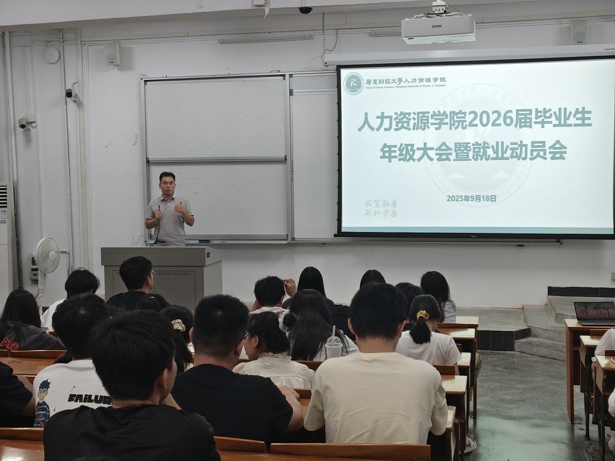 9月18日晚上,人力资源学院2026届毕业生年级大会暨就业动员会在博学楼 110 教室顺利召开。学院党委书记黄东阳、党委副书记阮方明、专任教师马银坡、辅导员巫健坤与2022级全体本科生共同参会,为毕业生职业发展规划搭建交流平台。