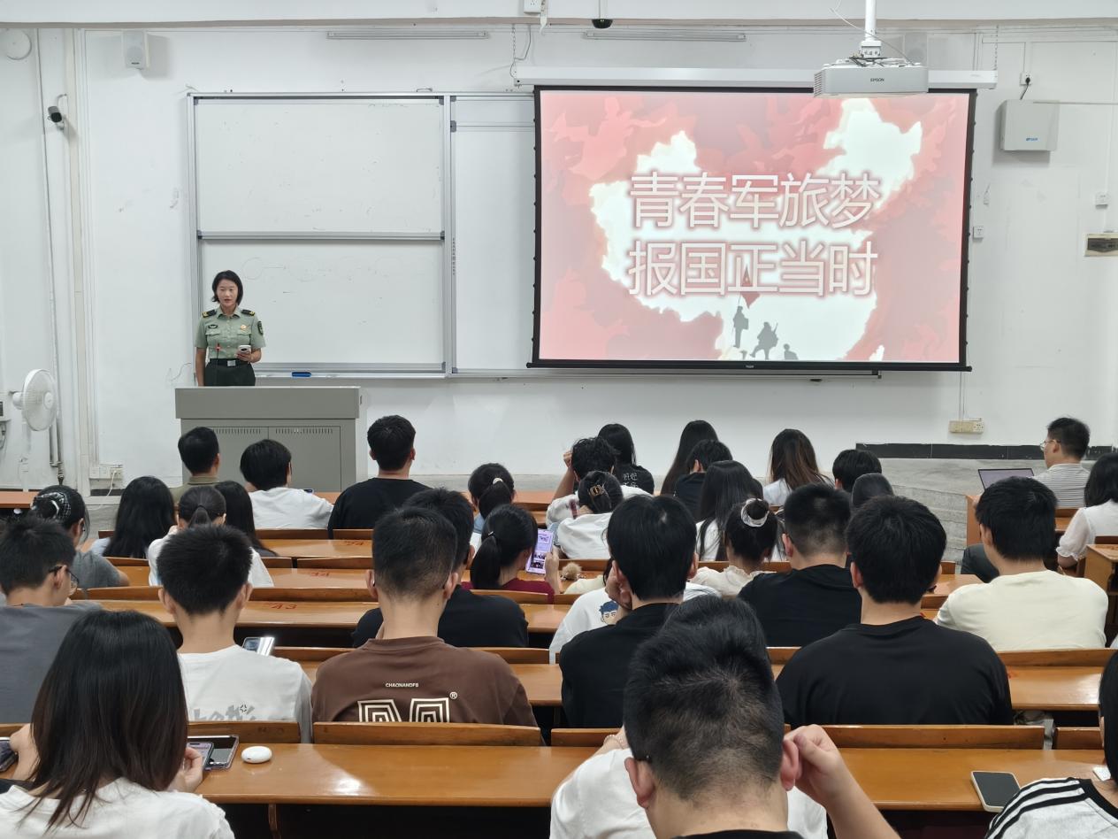 退役学生代表林洵以飒爽英姿登上讲台,她以个人经历讲述军旅磨砺与成长,同时详细介绍大学生入伍优惠政策与发展前景,热情鼓励有意愿的同学投身国防事业,将个人理想熔铸于强军梦。