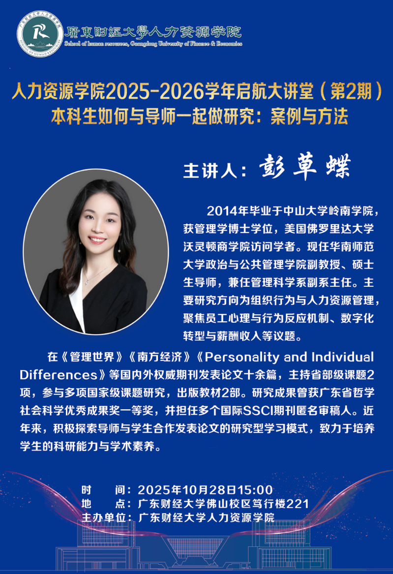 讲座通知:人力资源学院2025-2026学年启航大讲堂(第2期)本科生如何与导师一起做研究:案例与方法