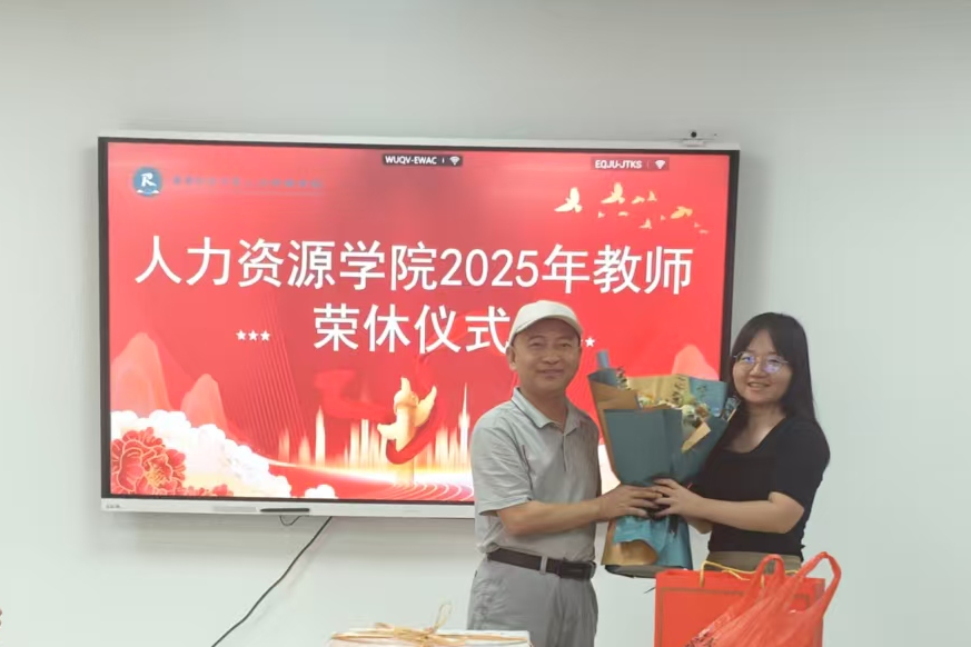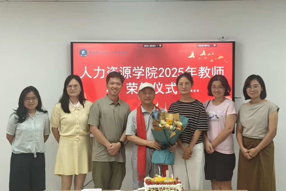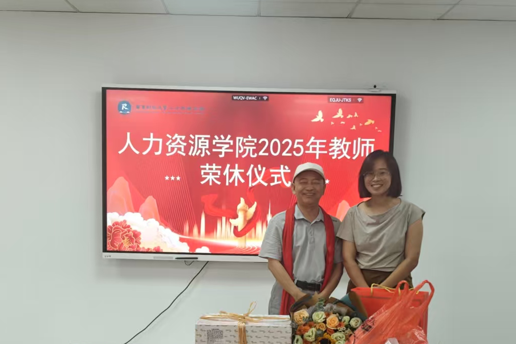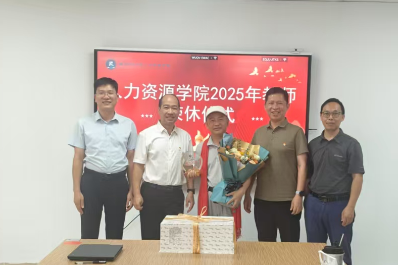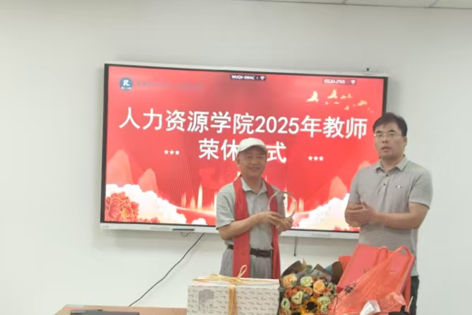 为传承榴园精神,增强退休教师的归属感和幸福感,不断提升学院教职工凝聚力,7月7日下午,人力资源学院在广州校区勤学楼901举行2025年教师荣休仪式,今年唯一一位退休教师、人力资源管理系刘俊教授和全体教职工参加。仪式由学院党委书记黄东阳主持。