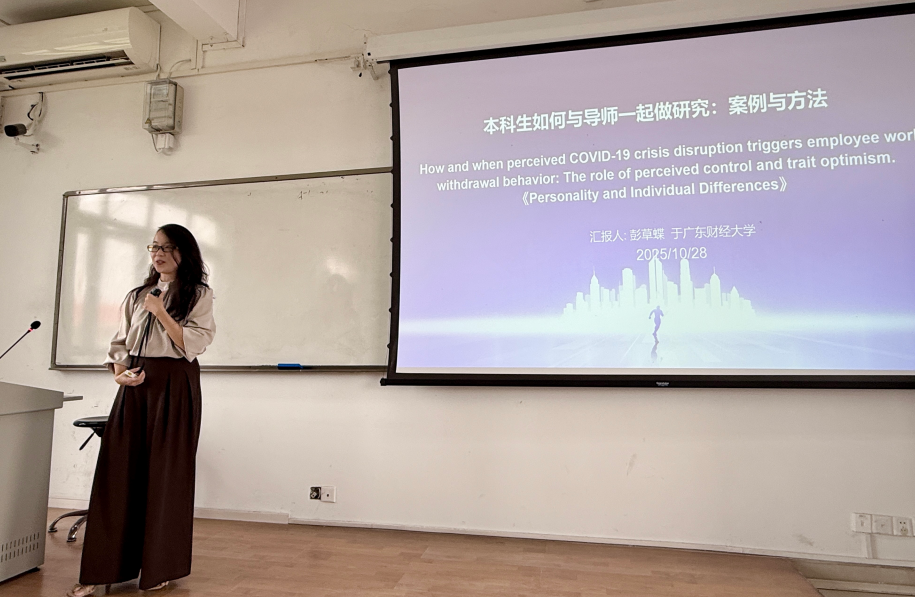讲座中,彭草蝶副教授以《危机冲击下员工为何“想躺平”?——工作退缩行为的心理机制研究》为例,系统呈现了从研究构思、文献梳理、问卷设计、数据收集、模型构建到论文撰写与修改的完整科研流程,具体阐释了本科生在科研项目中承担的角色与任务,生动展示了本科生参与导师科研项目的全过程。