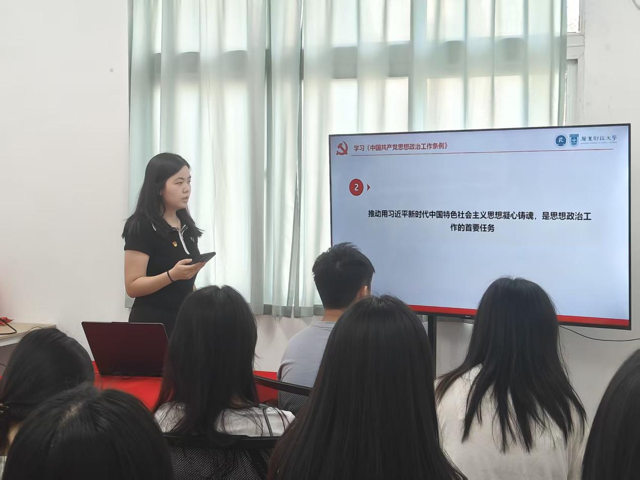 紧接着围绕《中国共产党思想政治工作条例》开展学习,学习重点围绕《条例》中关于坚持和加强党的全面领导、推动用习近平新时代中国特色社会主义思想凝心铸魂、发挥群团组织作用以及加强思想政治工作队伍建设等内容展开。特别强调了《条例》在学校思想政治工作中的具体要求,包括坚持思政课建设和党的创新理论武装同步推进,构建以习近平新时代中国特色社会主义思想为核心内容的课程教材体系。