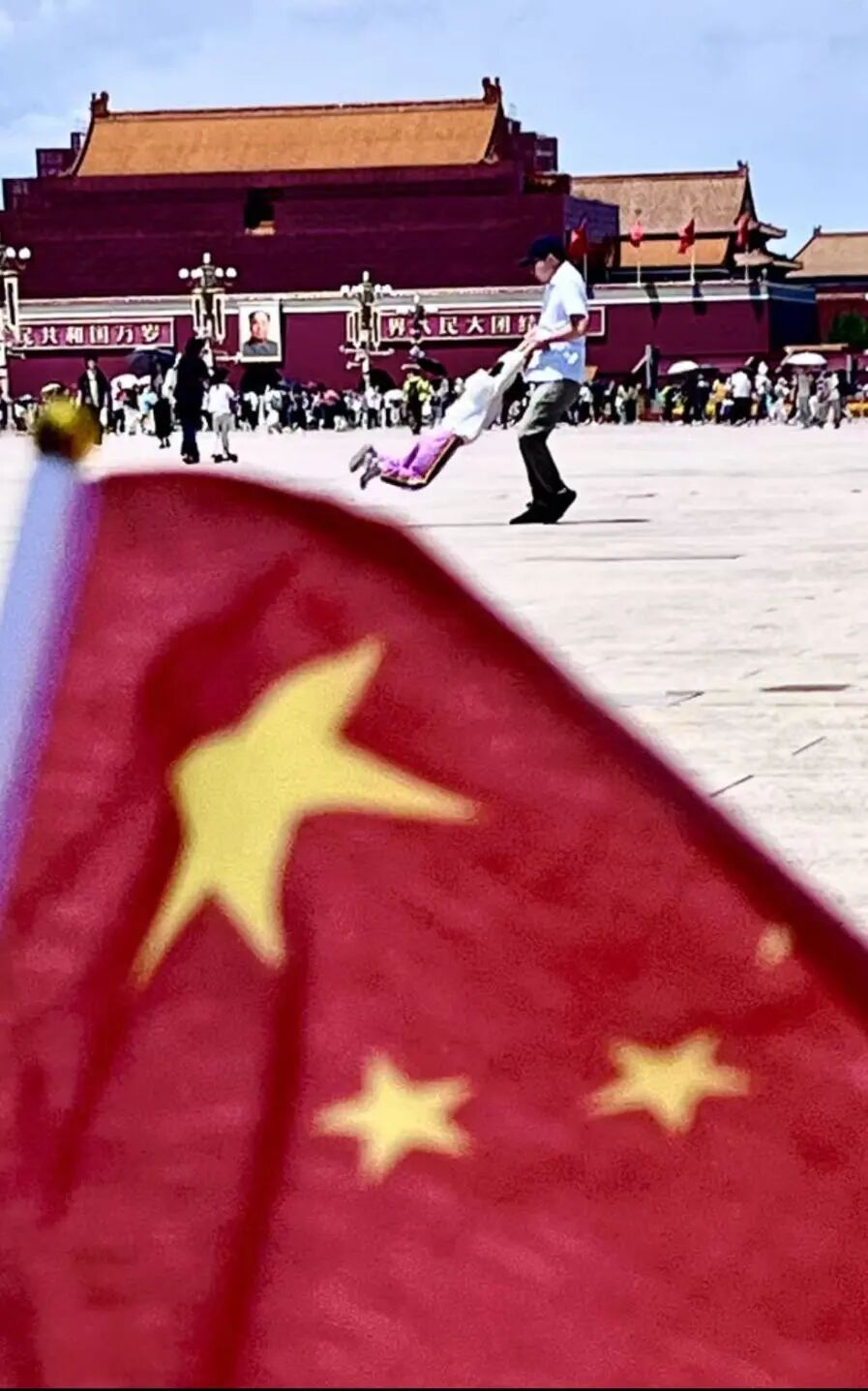 天安门广场上,旗帜猎猎、朝阳初升。人们或驻足凝望,或携手同行,满怀深情地表达着对祖国的热爱与祝福。镜头捕捉下的,是一份平凡生活中的庄严情感,是一代青年的真挚赤诚。