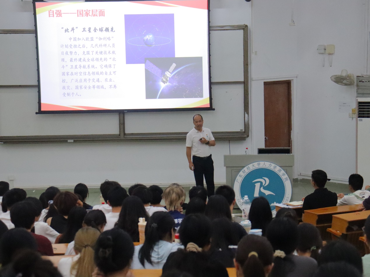 课堂上,黄东阳从“自信、自强、自励、自律”四个方面展开阐述,结合时代案例和身边故事,引导同学们深刻思考新时代青年的使命担当。他以“四个自信”为切入点,从国家、社会、组织与个人四个层面讲述“立根铸魂、拥抱时代”的现实意义,鼓励同学们坚定信念、砥砺奋进。结合福建舰正式服役、《黑神话:悟空》展现东方美学、DeepSeek大模型实现技术突破等鲜活案例,生动讲述自强精神如何激发民族创新活力。