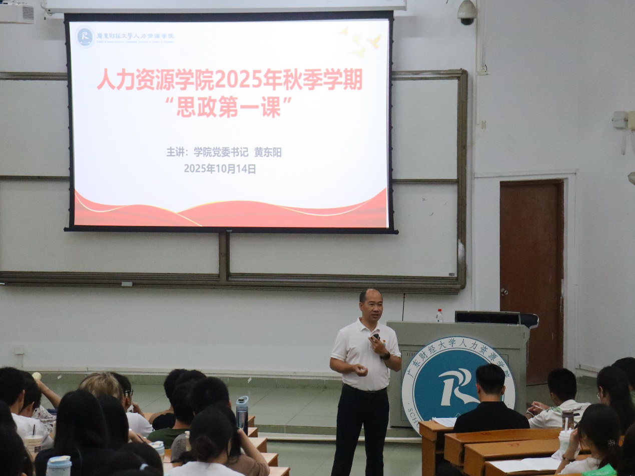 为深入学习贯彻习近平新时代中国特色社会主义思想,教育引导青年学生坚定理想信念、厚植家国情怀,10月14日晚,人力资源学院2025年秋季学期“思政第一课”在佛山校区励学楼208举行。学院党委书记黄东阳以《以青春之我,赴时代之约》为题,为2025级全体新生、学生党员、预备党员、入党积极分子、学生骨干及入团积极分子等280余名同学讲授了一堂立意深远、内涵丰富的思想政治课。