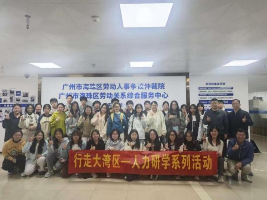 为深入学习贯彻党的二十届四中全会精神,引导学生“知湾区、懂湾区”,提升学科专业认知与社会实践能力,11月18日下午,人力资源学院开启首期“行走大湾区”研学系列活动。学院党委书记黄东阳,副院长宋一晓、魏伟及相关老师带领5个班级分别走进广东省人才服务局、广州市海珠区劳动人事争议仲裁院,广州弘亚数控机械集团股份有限公司,广州鲁邦通物联网科技股份有限公司,广东三新集团等单位参加研学。