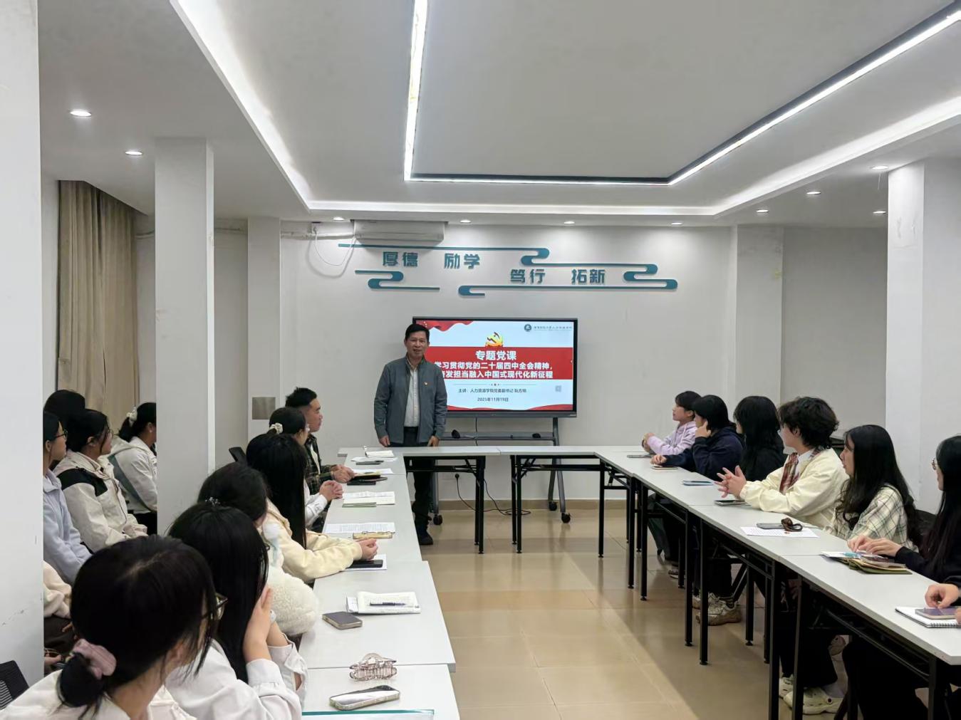 为深入学习贯彻党的二十届四中全会精神,引导青年党员找准人生坐标、主动担当作为,11月19日晚,人力资源学院党委副书记阮方明面向学生第一党支部全体党员,在广州校区玉兰苑学生社区党团活动室开展了以 “学习党的二十届四中全会精神,奋发担当融入中国式现代化新征程”为主题的专题党课。