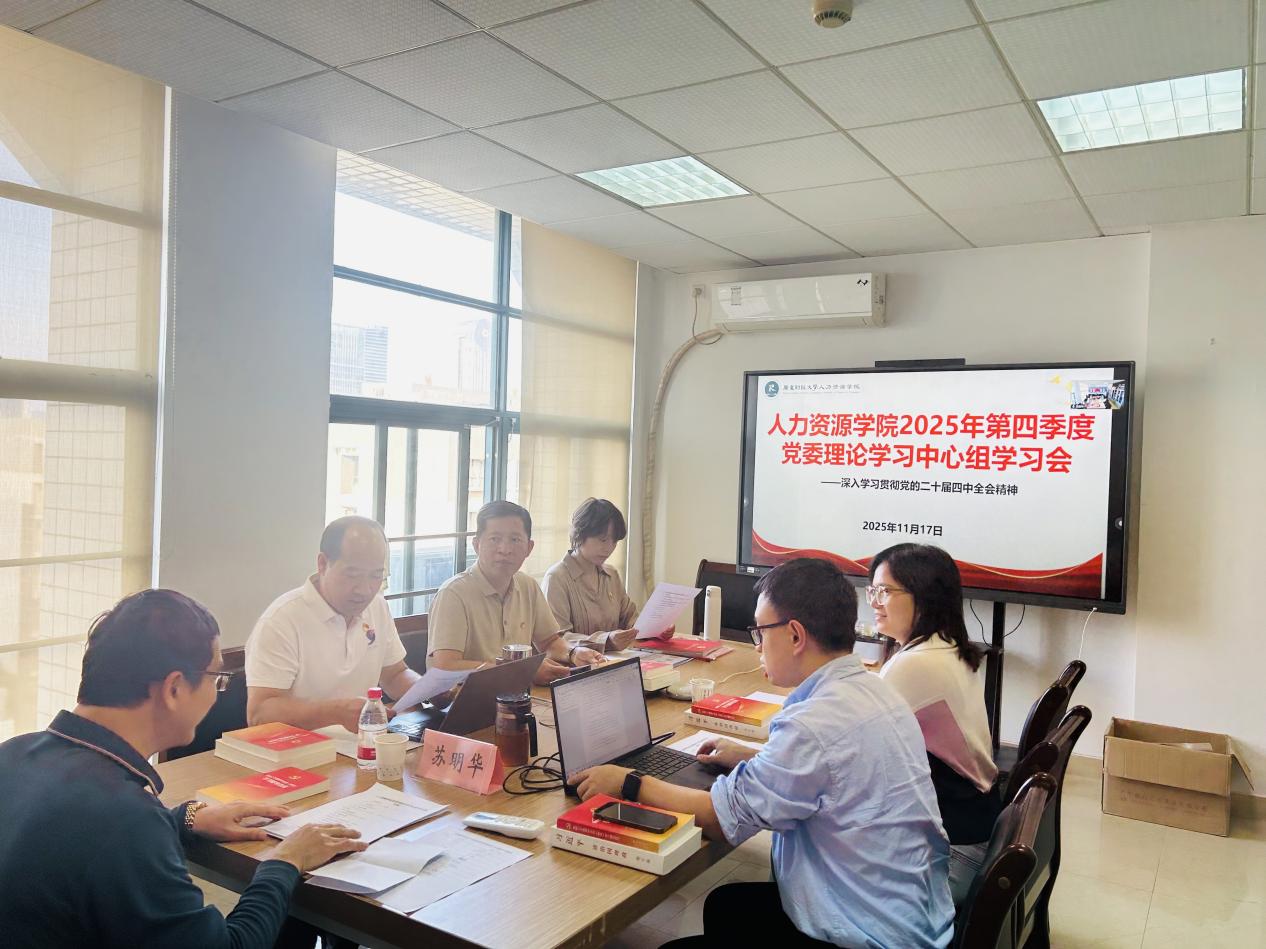 11月17日下午,人力资源学院党委在广州校区勤学楼910会议室召开理论学习中心组(扩大)学习会,专题学习党的二十届四中全会精神。校党建工作督导组督导员苏明华到会指导,学院党委领导班子成员、党委委员及各党支部书记参会,会议由学院党委书记黄东阳主持。