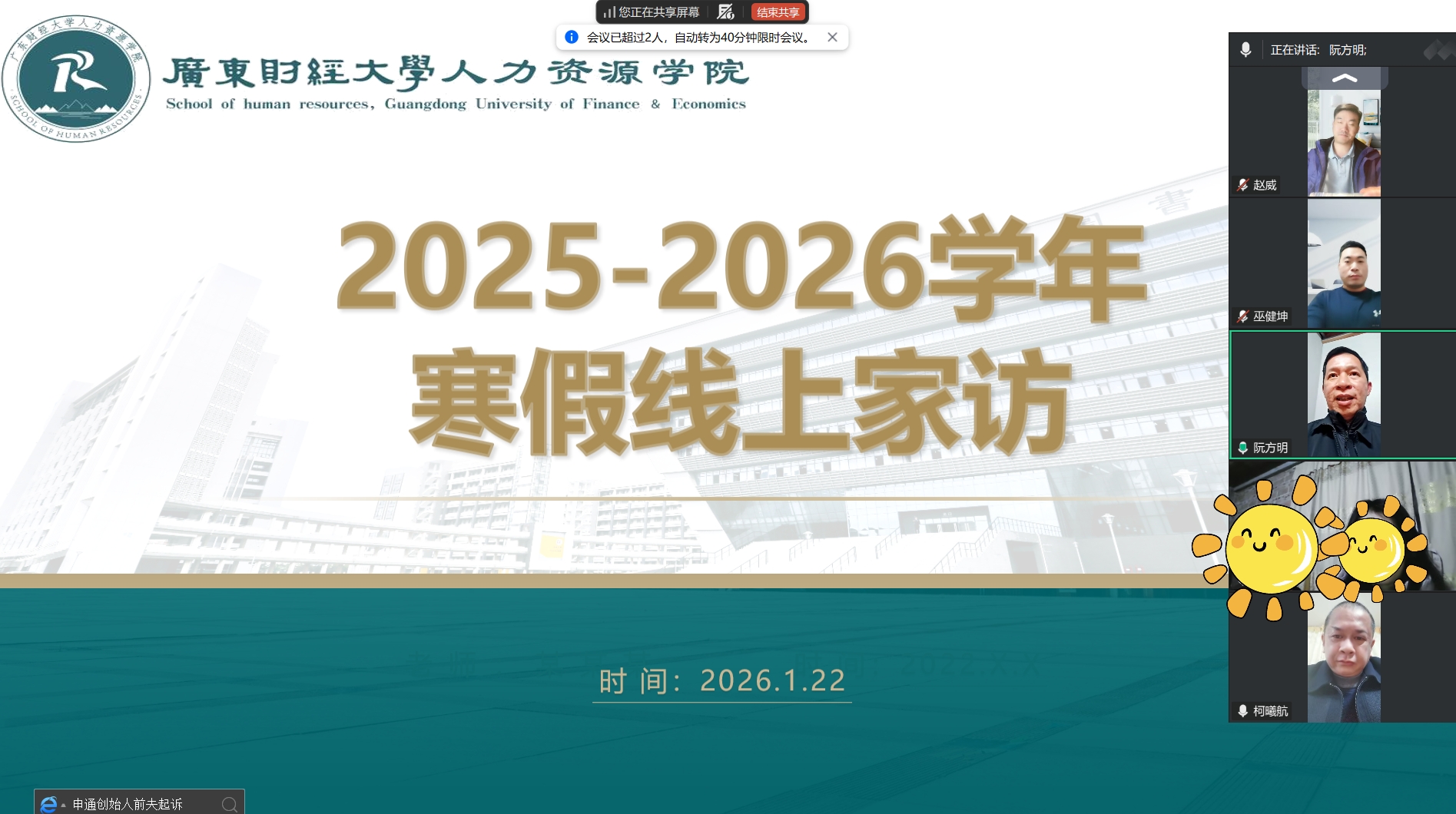 2026年1月17日—22日,人力资源学院通过线上线下融合模式开展了寒假家访活动,由学院党委副书记阮方明带队,辅导员巫健坤、徐海丽、赵威组成家访小组走进中山、佛山、茂名三地,与当地校友会联动,实地走访2名和线上走访1名困难学生家庭,共同构建起“学院+校友”双线联动的育人新模式。