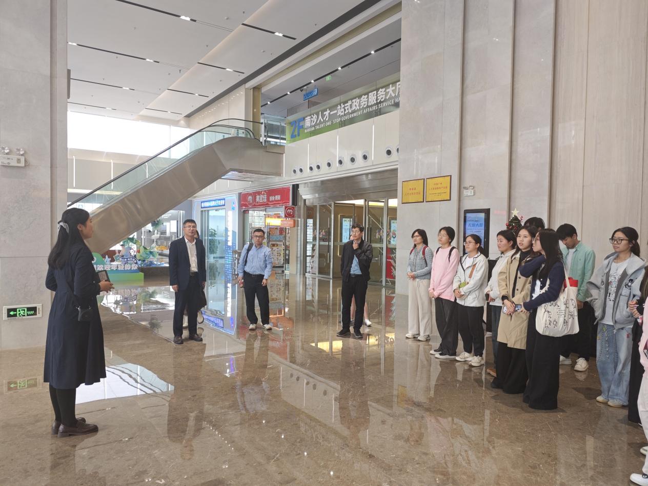 12月19日下午,人力资源学院副院长宋一晓、魏伟带领“行走大湾区”研学活动第二期的各系老师和2023、2024级学生26人,走进了南沙国际人才港和中国广州人力资源服务产业园南沙园区,深入了解南沙人才服务工作,以及南沙园区人力资源服务业的发展情况,深度感受南沙在产业创新、人才集聚与科技创新领域的蓬勃活力,南沙国际人才服务官团队陪同调研。