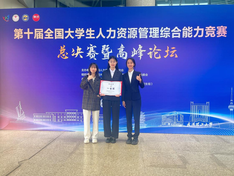 我校人力资源学院参赛团队由2023级人力资源管理专业王雯婷、叶海柔、曾语晖3位同学组成,宋一晓、黎晓丹两位老师作为指导老师,宋一晓、张霞两位老师作为带队老师带领学生前往武汉参赛。