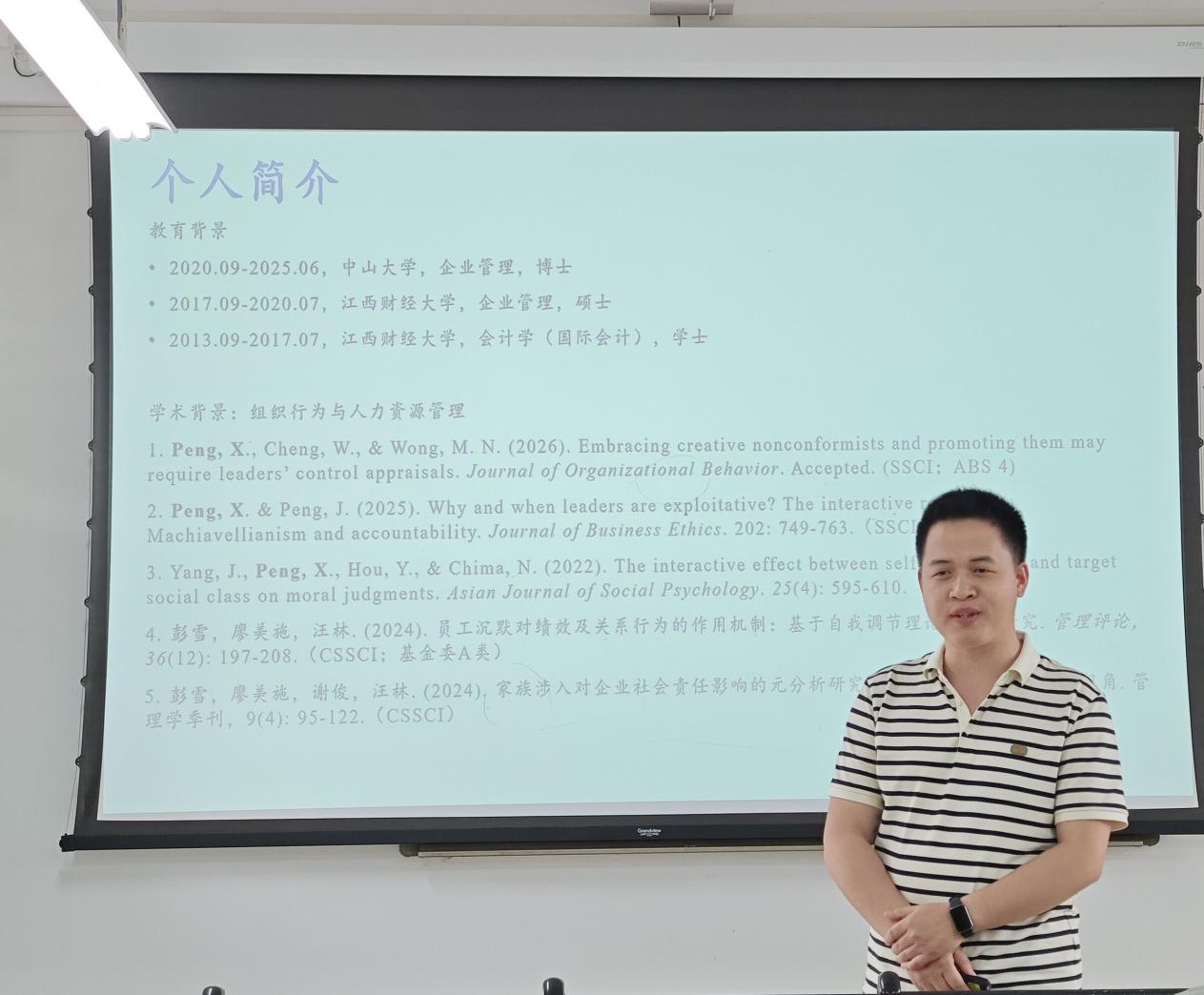 3月24日下午,学院举办2025-2026学年“启航大讲堂”第7期,特邀广东外语外贸大学商学院博士后研究员彭雪莅临我院,开展题为“研究没那么远:本科生走近科研的思考与分享”学术讲座,学院人力资源管理专业学生参加。讲座由人力资源管理系主任黄嘉欣教授主持。